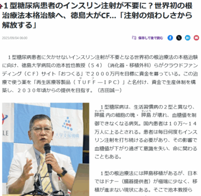 1型糖尿病根治を目指す再生医療 徳島大 根治療法本格治験へ(読売新聞オンライン20250904)