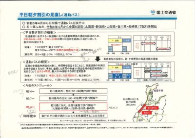 しまなみ海道の通行料金を島民について割引ができないか?その制度に一番近いところにあるのが「平日朝夕割引」の見直しです。「平日朝夕割引」を発展させて「通勤パス」にし、それを本四高速についてもETCを登録した島民について適用することだと私は考えています。その方向に国が向いていくように国交委員会で金子大臣に質問しました。