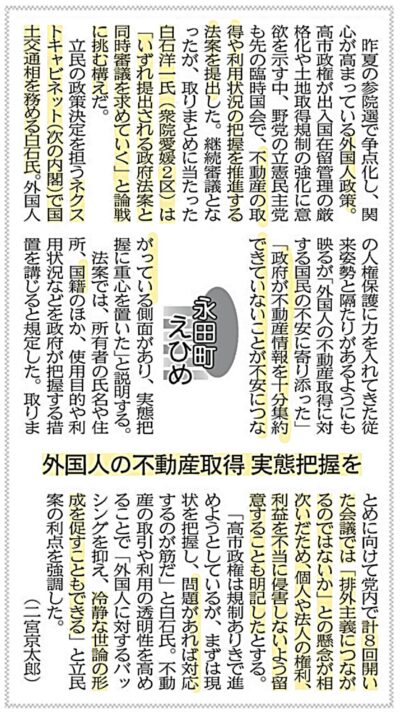外国人による土地・不動産取得についての不安が多く発信されており、7月参院選でも論点として急浮上しました。本件についてはまず政府が実態を把握できていないことが最大の問題と私は考えます。既存制度(登記法・国土利用計画法・農地法・森林法・外為法・重要土地調査法など)は所管がバラバラ・対象範囲が狭い・事後届出が多いため網羅的な把握が不可能といえます*。こうした状況を踏まえ、網羅的・実効的に土地取得の実態(特に国籍)を把握するためのプログラム法として党内喧々諤々8回もの合同部門会議の議論を経て立案しました。法人は「実質的支配者」の国籍で判断するようにしましたので、森林や水源地など大量保有する企業の“実質的外国化”も把握可能になります。