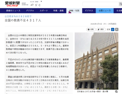 【公立校教員不足|愛媛など悪化】(愛媛新聞20260306)