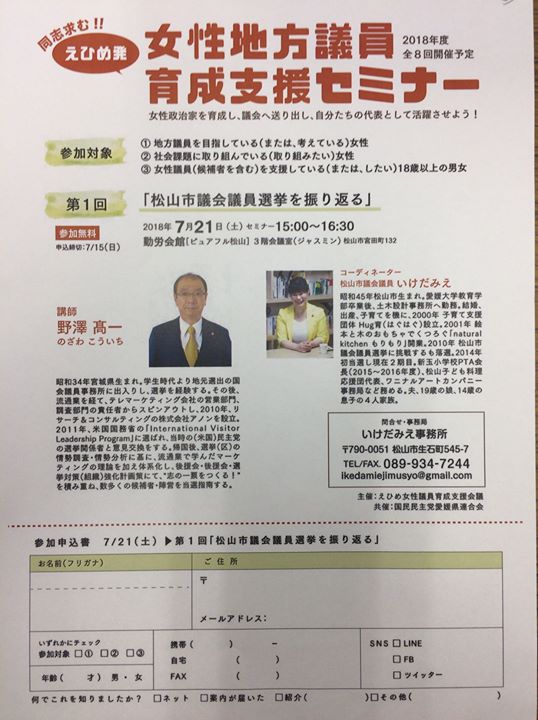 来る7月21日(土)15:00より松山市の勤労会館で、池田みえ松山市議が講師を迎えて「女性地方議員育成支援セミナー」を開催します(写真参照申し込み用紙付き.無料です)。